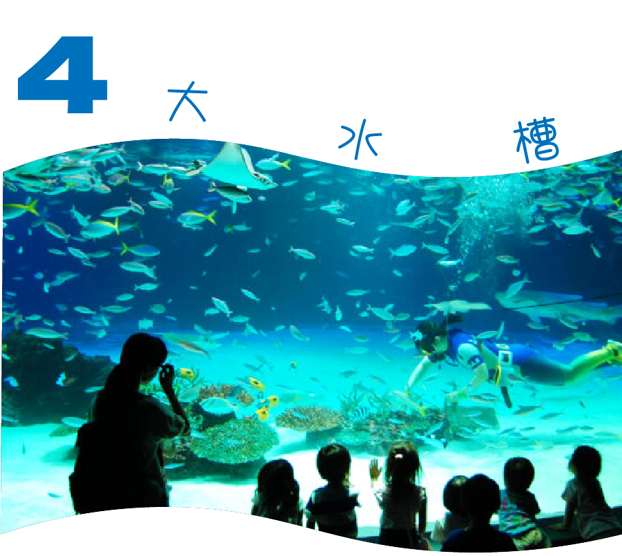大水槽では、群れをつくって泳いでいるお魚さんがいます。 飼育員さんも一緒に泳ぐ姿がみえるかも?