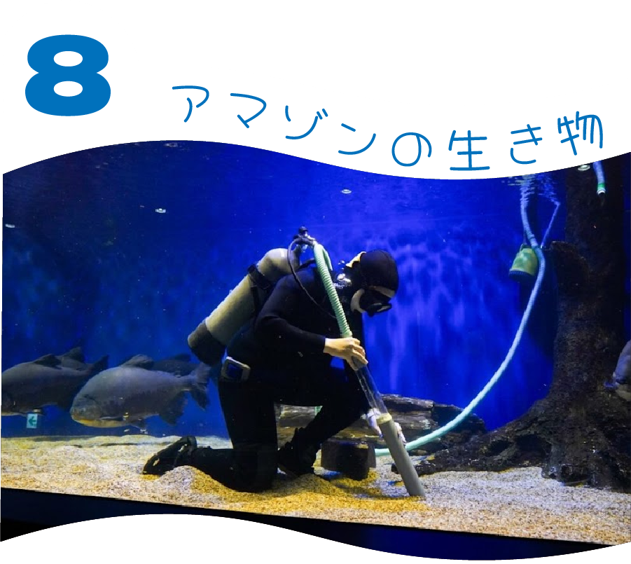 主役が隠れてしまっていますが、 アマゾンに生息しているお魚さんが見られます。 巷では飼育員さんが隠れ人気みたいですね....