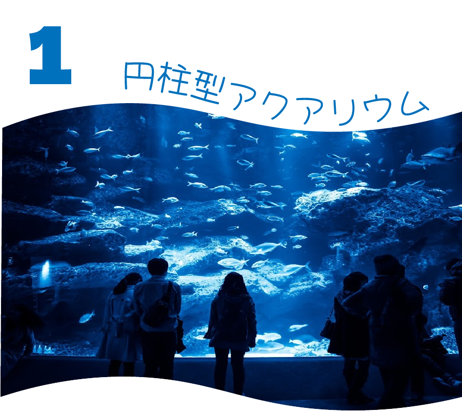 大きい円柱型のアクアリウムが皆様を出迎えてくれます。 天井まである迫力間をお楽しみください。